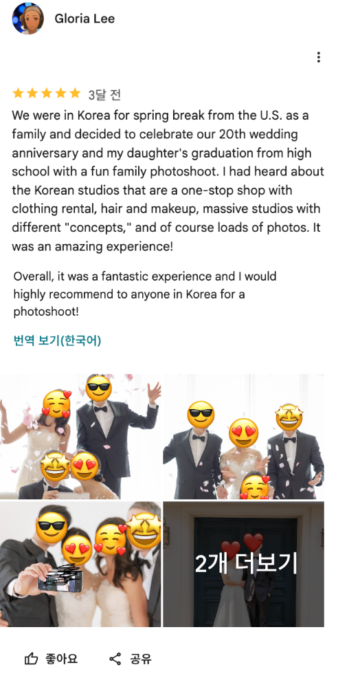 최근 미국에서 가족과 함께 방문해 20주년 결혼기념일과 따님의 고등학교 졸업을 기념하는 촬영을 진행하신 Gloria L. 님의 소중한 후기를 공유합니다.